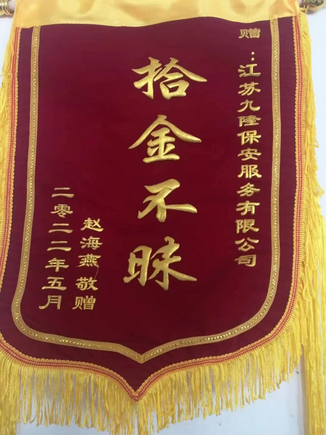 2022年5月9日,驻军嶂新村保安队班长董建中在小区巡逻时捡到一个钱包,内有身份证2张,银行卡一张,健身卡一卡,现金二百。董班长根据失主的身份证信息找到了是247-302业主的,找到业主后,交还失物。钱包失主赵女士于2022年5月18日把一面拾金不昧的锦旗送到小区值班室,表示对董班长的感谢之情。